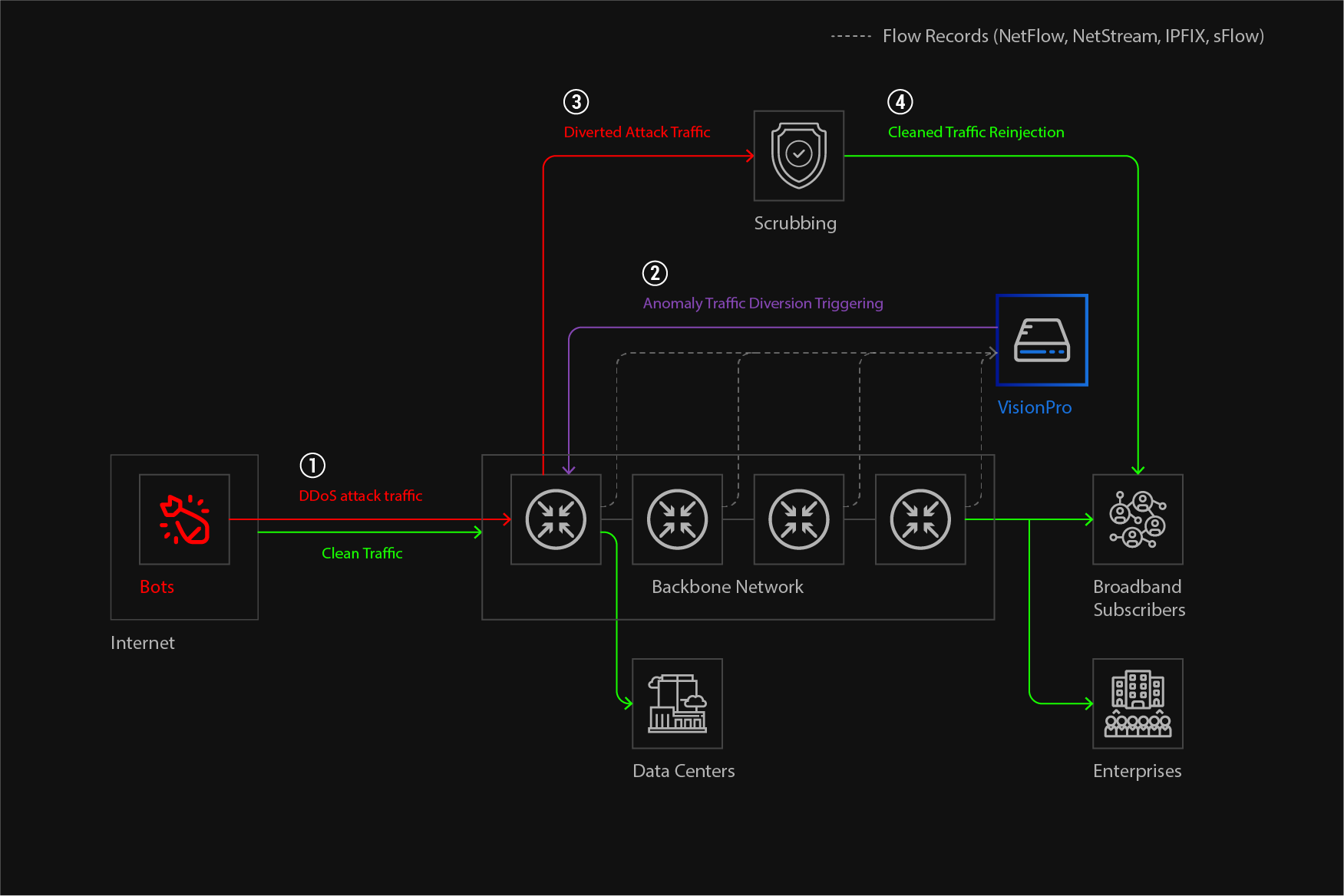 VisionPro 是为网络运营商 (ISP)、数据中心 (IDC) 及大型企业所打造的专业级网络流量分析及安全防护产品,它支持电信等级的网络规模与效能,并具备 99.999% 的电信级可靠度。内建网络流量智慧分析模型以及异常检测引擎,VisionPro 能提供强大的流量数据挖掘、快速的 DDoS 攻击防护、以及强性化的流量分析报表,提供电信网管人员优化策略的重要支撑数据。