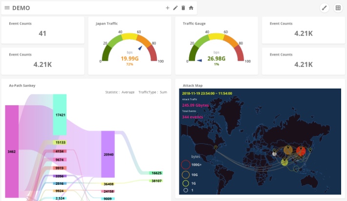 用户可依自行监控及管理需求,将各流量图表于仪表盘页面编排呈现,让所有关键指标一目了然。用户亦可配置多个不同仪表盘,并将其相互联结,以获取更详细的分析资讯。