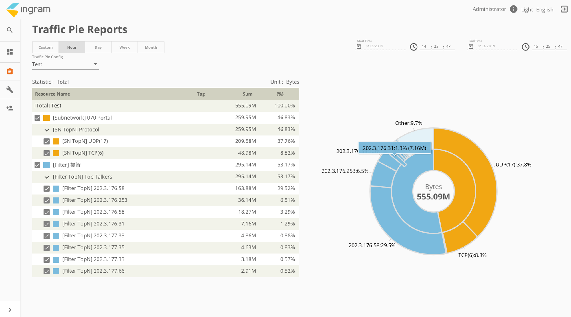以占比式的阶层式饼图呈现,展现 VisionPro 中的 Filters、Sub-Networks 及 Server Farms 的流量组成,并透过图形化介面的互动点选,深入挖掘各阶层的流量占比,简单实现如 DNS 本网率、虚假源地址分析等应用。